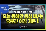 오늘 동해안. 강원산지 중심 비.눈, 당분간 내륙 중심 아침 기온 낮아 (26년 2월 16일 05시 기준)