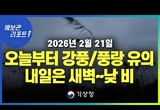 오늘 오후부터 강풍.풍랑 유의, 내일은 새벽부터 낮 사이 비 내려 ( 26년 2월 21일 05시 기준)