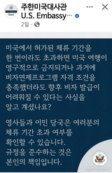 주한 美대사관, ' 美서 허가 체류기간 초과자 美여행 영구금지.비자발급 어렵다'
