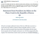 조 바이든 미 대통령 부부 무안 제주항공 사고 성명 발표 '깊은 슬픔 느껴... 필요한 모든 지원…