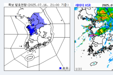 [[기상청 특보]] 현재(21시), 중부지방과 전북북서부에 호우특보 발효 (7월 16일 21시 10분)