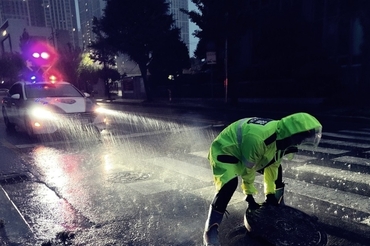 "맨홀 뚜껑이 없어요!"신고 ... 출동 경찰 폭우속 긴급대처 위기 모면