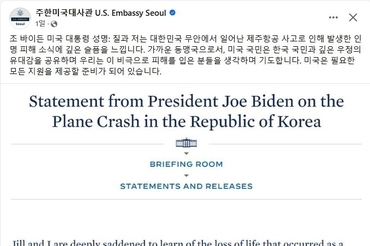 조 바이든 미 대통령 부부 무안 제주항공 사고 성명 발표 '깊은 슬픔 느껴... 필요한 모든 지원 제공'