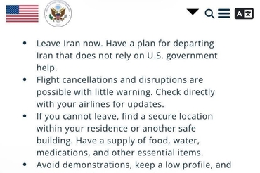 [ 긴급 속보 ] 美 정부,이란 체류 자국민 즉시출국 권고 ' 항공편 중단. 돌발 상황 경고'