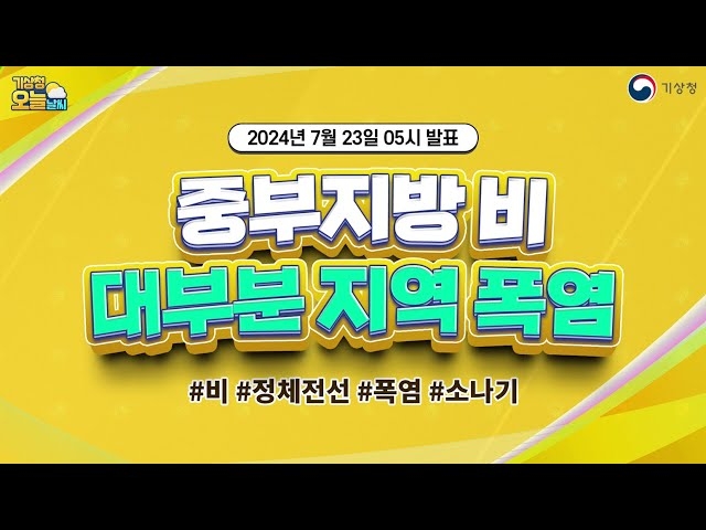 오늘 정체전선의 영향으로 중부지방을 중심으로 비가 내리는 곳이 있겠고요. 남부지방에도 아침까지 비가 내리는 곳이 있겠습니다. 그리고 전라동부와 경남서부에는 대기불안정에 의해 소나기가 내리는 곳이 있겠습니다. 현재 호우특보는 경기남부와 강원영서남부 및 충남북부서해안에 호우특보가 발효 중인데요. 서해상에서 비구름이 점차 유입되면서 추가적으로 호우특보가 발표될 가능성이 있겠으니 비 피해가 없도록 각별히 유의하시기 바랍니다.