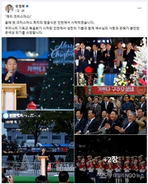 인천광역시 유정복 시장은 지난 1일 애뜰광장에서 인천기독교총연합회가 주최한 '2024년 성탄트리 점등식 및 시민문화축제'에 참석해 축사를 하고 국내 최초로 가진 성탄 트리 점등과 축제를 축하했다.