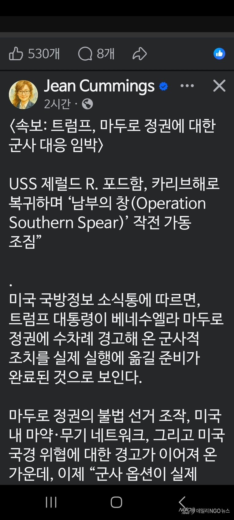 【 단독. 긴급 특보 】美 전 언론인 이자 컬럼니스트인 Jean Cummings가 자신의 소셜네트워크를 통해 8일 '트럼프, 마두로 정권에 대한 군사대응 임박' 이란 속보 소식을 전했다.