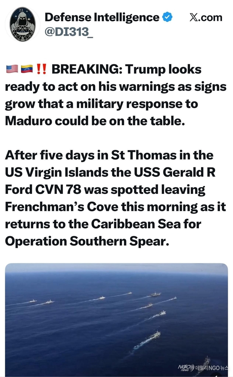 그는 '특히 주목되는 점은 미국 버진아일랜드 세인트 토머스에 5일간 머물렀던 “미국 최신예 항공모함 USS 제럴드 R. 포드(CVN-78)”가 금일 아침 프렌치맨스 코브(Frenchman’s Cove)를 떠나 “카리브해로 회항한 것이 포착”되었다는 사실'이라면서 '이는 곧 “‘오퍼레이션 서던 스피어(Operation Southern Spear·남부의 창)’이 본격 가동될 수 있음을 의미”하며, 베네수엘라 주변 해역에서 미 해군의 전개가 강화되고 있음을 시사한다'고 밝혔다.