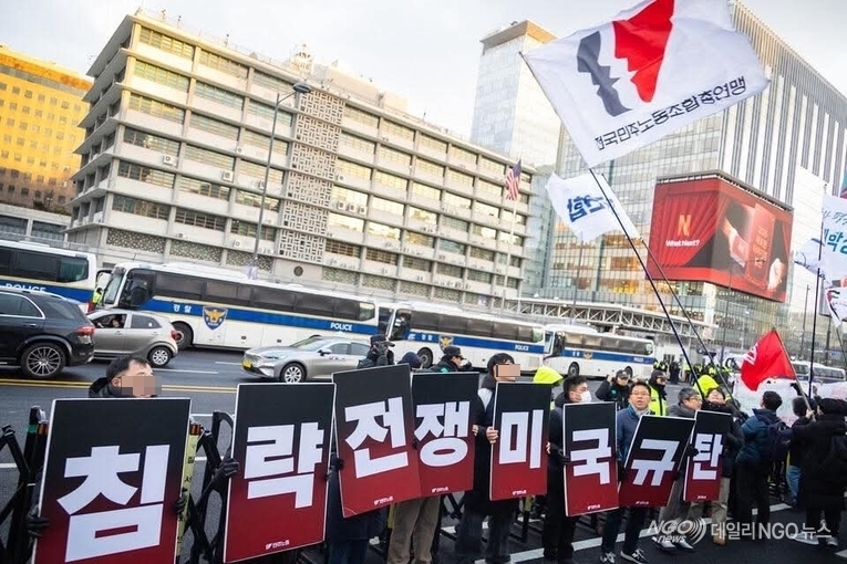 민주노총 등 여권 단체 美규탄집회 美대사관앞 건너편에서 집회를 하고있는 민주노총과 여권 시민사회 참가자들 (사진= 민주노총 자료)