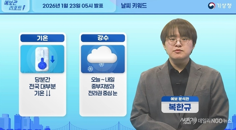 【 기상.날씨/ 눈.강한바람 】 안녕하세요, 예보관리포트 기상청 예보분석관 복한규입니다. 오늘의 날씨 키워드는 기온과 강수입니다. 그럼 자세히 알아보겠습니다