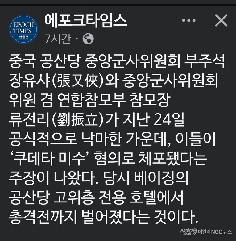 【 미디어=에포크타임즈/ 시진핑 쿠데타 위기 모면 】 에포크 타임즈가 '중국 공산당 중앙군사위원회 부주석 장유샤(張又俠)와 중앙군사위원회 위원 겸 연합참모부 참모장 류전리(劉振立)가 지난 24일 공식적으로 낙마한 가운데, 이들이 ‘쿠데타 미수’ 혐의로 체포됐다' 고 보도했다.