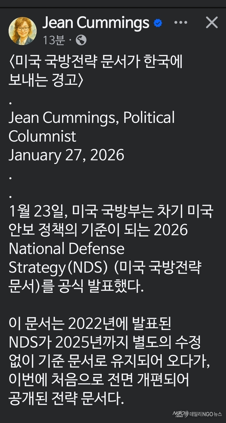 진 커밍스 (Jean Cummings)는 '정말로, 자신들의 돈으로, 자신들의 아들들의 피로, 대한민국을 스스로 지켜낼 준비가 되어 있는가'라면서 '이제는 그 질문을 스스로에게 던져야 할 시점에 들어섰다'라고 2026 미국 국방전력 공개 문서(NDS)에 수록된 내용을 분석 발표 했다.