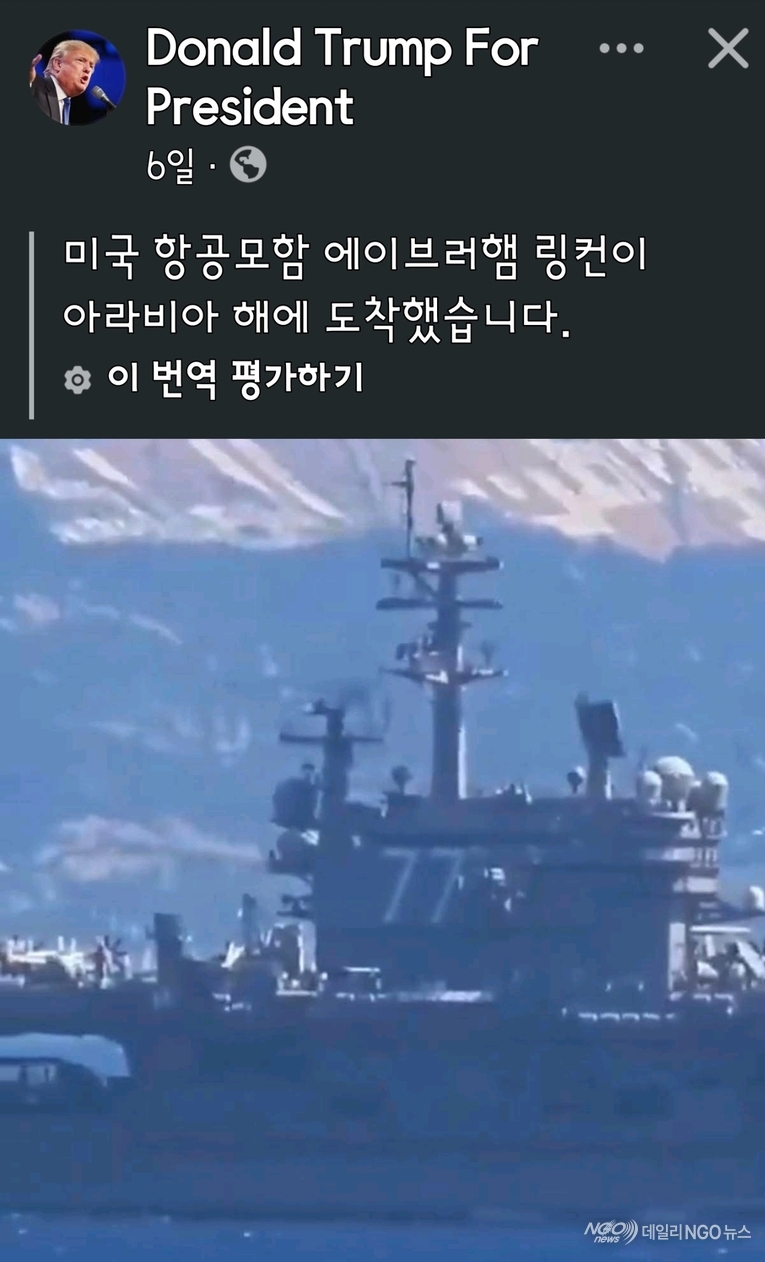 美 트럼프 대통령이 이란의 공격을 위한 조치로 출동시킨 항공모함 에이브러함 링컨호가 아라비아 호에 도착했다고 지지하는 측근 계정의 소셜 네트워크를 통해 공식으로 밝혀졌다.