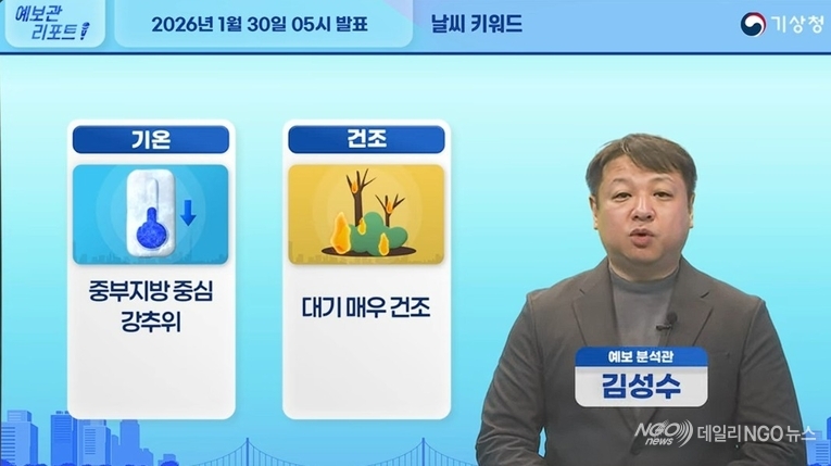 【 동영상.날씨=강추위. 건조.바람 】안녕하세요 기상청 예보관리포트 예보분석관 김성수입니다. 오늘의 이슈는 '기온'과 '건조'입니다. 그럼 지금부터 자세히 알아보겠습니다