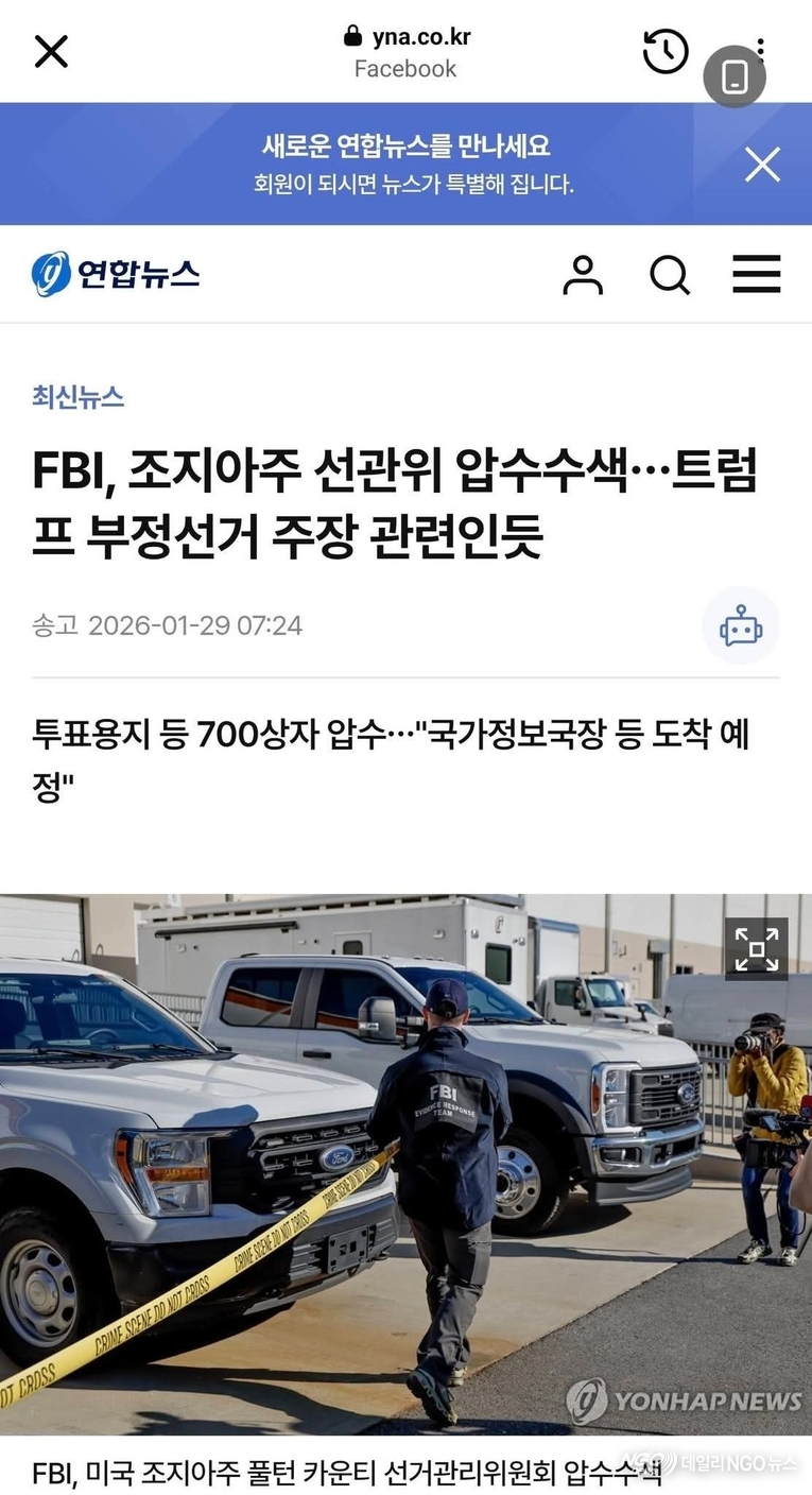 현재 연합뉴스TV, SBS 등 일부 채널에서만 FBI의 풀턴 카운티 압수수색 장면과 관련 영상을 전하고 있다.(계속) [인세영 기자 (승인 2026.01.29 19:13)]