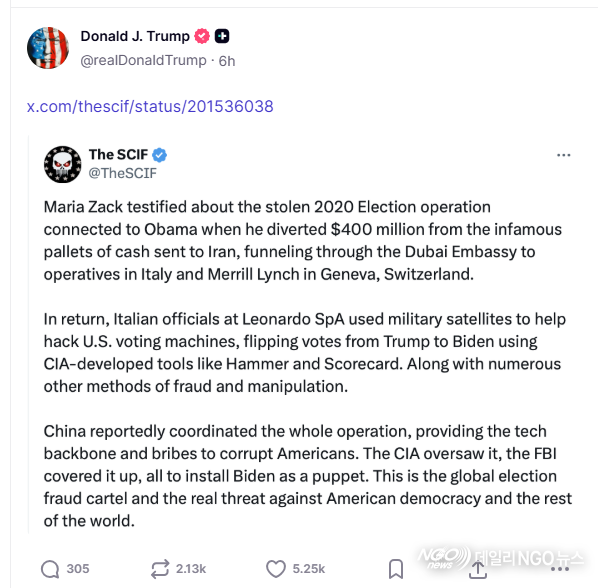 트럼프가 이날 주로 공유한 게시물은 친트럼프 성향 계정 ‘The SCIF’의 글이다. SCIF는 군사·정보·안보 이슈를 다루는 계정으로, 2020년 대선 이후 부정선거 의혹과 관련된 내용을 지속적으로 게시해 왔다. 트럼프는 최근 이 계정의 게시물을 높은 빈도로 공유하며 관련 주장을 자신의 소셜미디어를 통해 확산시키고 있다.