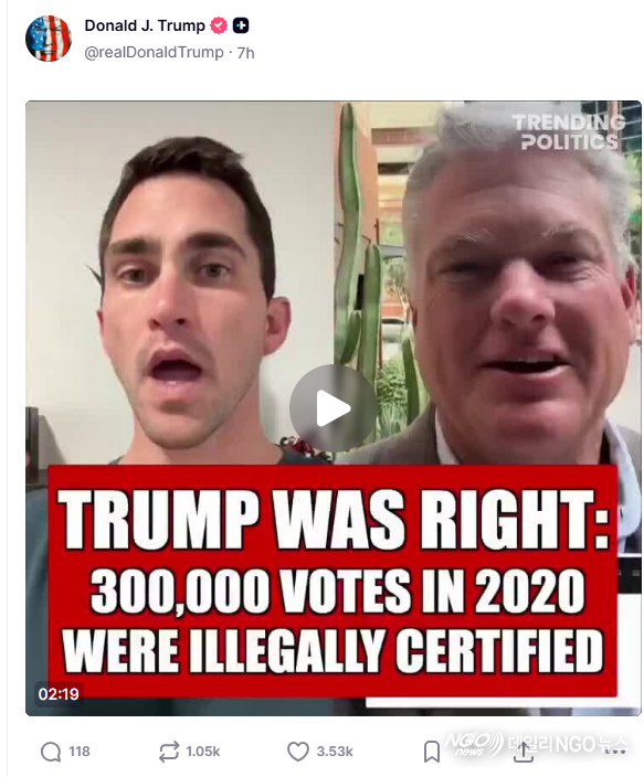 또 다른 게시물에서는 “2020년 대선에서 조지아의 풀턴 카운티에서 30만 표가 불법적으로 인증됐다”는 문구가 삽입된 영상이 공유됐다. 해당 영상은 조지아의 풀턴 카운티 선관위가 30만 표를 불법적으로 카운트 했다는 것을 인정했다는 내용이다. 투표 관리관의 서명이 없는 투표용지를 카운팅 했다는 내용으로 이는 불법이라는 것이다. 트럼프는 이 같은 게시물을 통해 개별 사례가 아닌 전국적·조직적 선거 범죄라는 점을 강조했다.
