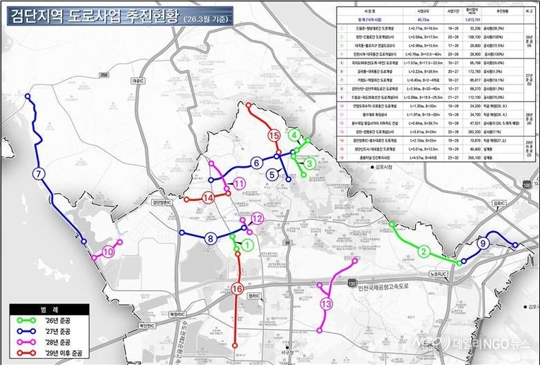 인천시가 밝힌 프로젝트는 첫째, 검단지역에서는 검단양촌IC~봉수대로, 금곡동~대곡동 구간 등 총 16개 도로사업이 추진되는 사업으로 총연장 40.73km, 사업비는 약 1조 6,137억 원에 달한다.
