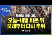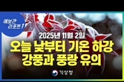 [데일리NGO뉴스 = 동영상/ 기상.날씨 ] 【 특보/ 한파 주의 】 안녕하세요 예보관리포트 기상청 예보분석관 곽대영입니다. 오늘의 날씨 키워드는 기온 그리고 강풍과 풍랑입니다 그럼 자세히 알아보겠습니다. 먼저 기온 전망에 대해 알아보겠습니다. 오늘부터 중국 북부지방에서 서해상으로 확장하는 찬 대륙고기압의 영향을 받겠는데요 차고 건조한 공기가 북서풍을 따라 우리나라로 유입되면서 오늘 낮부터 기온이 낮아지겠습니다 특히 기온이 낮은 가운데 바람도 강하게 불어 체감온도가 더욱 낮아 춥겠고 내일과 모레 아침 기온은 오늘보다 5~10℃가량 큰 폭으로 떨어져 내일은 전국 내륙을 중심으로 모레는 경기동부내륙과 강원내륙.산지를 중심으로 영하로 내려가는 곳이 있겠으니 오늘 11시 30분에 발표할 한파영향예보를 참고하여 낮은 기온과 급격한 기온변화로 인한 건강관리에 유의하기 바랍니다 또한 내일과 모레 전국 내륙을 중심으로 서리가 내리는 곳이 있겠고 중부내륙과 강원산지, 남부지방 높은 산지를 중심으로 얼음이 어는 곳도 있겠으니 수확철 농작물 관리에 각별히 유의하기 바랍니다 이어서 강풍과 풍랑 전망입니다. 중국 북부지방의 찬 대륙고기압이 서해상으로 확장하면서 동해상에 위치한 저기