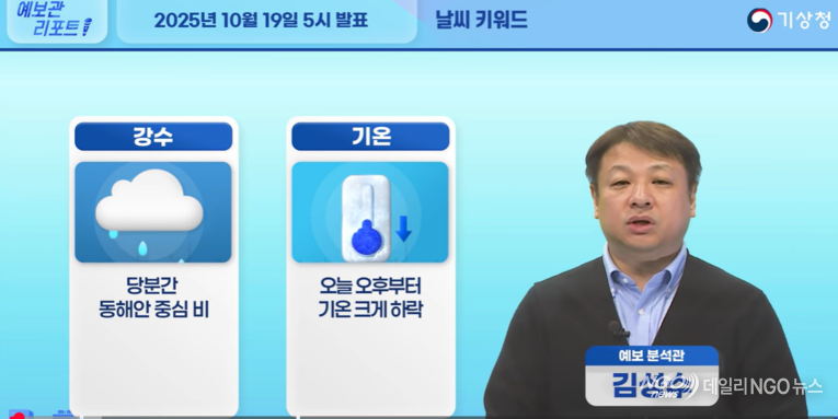 안녕하세요 기상청 예보관리포트 예보분석관 김성수입니다. 당분간 동해안을 중심으로 비가 내리겠고 오늘 오후부터 기온이 크게 떨어져 춥겠습니다