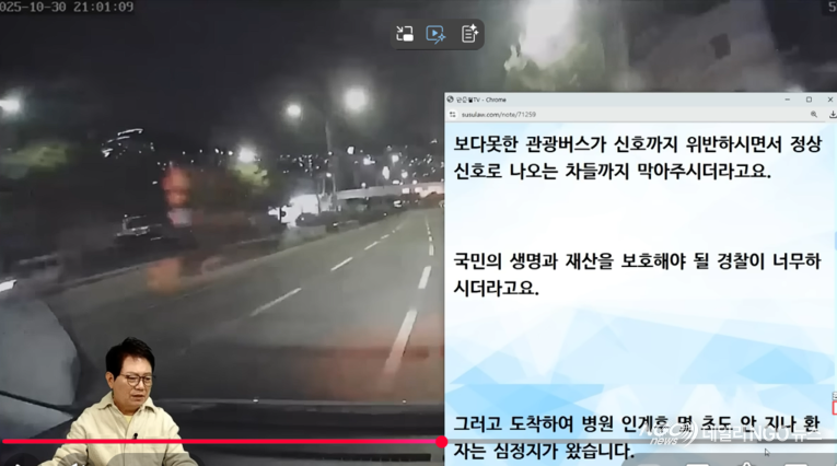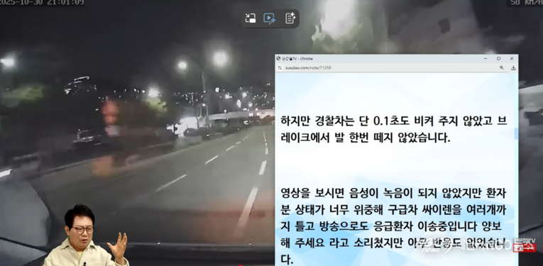 한 변호사는 '복부 역과 사고를 당한 임신부를 태우고 긴급 이송중인 구급차 앞에서 비켜주지 않는 경찰차…'란 표제로 방송을 진행했다.