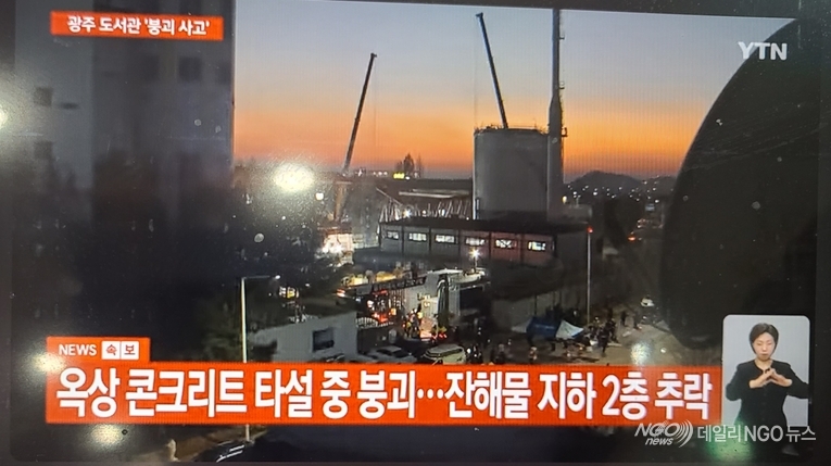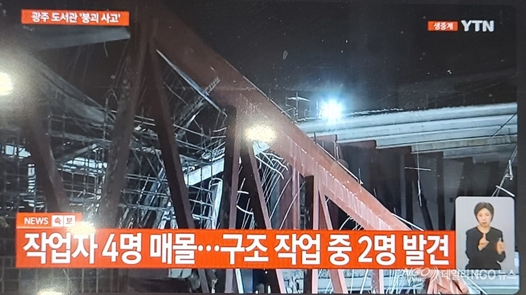 광주 상무지구 신축도서관 공사현장 붕괴 광주 서구 치평동에서 추진 중인 광주대표도서관 신축 공사 현장은 11일 오후 철골 구조물이 붕괴되며 1명 사망·3명 매몰이라는 중대 재해로 이어졌다. (사진= YTN 보도영상 캡쳐 )