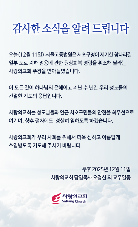 공지문에서 사랑의교회는 “오늘(12월 11일) 서울고등법원은 서초구청이 제기한 참나리길 일부 도로 지하 점용에 관한 원상회복 명령을 취소해 달라는 사랑의교회 주장을 받아들였다”라고 승소 소식을 알리며, “이 모든 것이 하나님의 은혜이고 지난 수년간 우리 성도들의 간절한 기도의 응답”이라고 소회를 밝혔다.