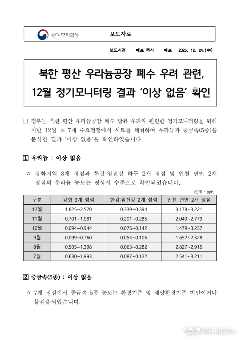 【 정부부처/ 北평산 폐수 】정부는 지난 12월 24일 관계부처 합동 보도자료를 통해 '북한 평산 우라늄공장 폐수 방류 우려와 관련한 정기모니터링을 위해 지난 12월 초 7개 주요정점에서 시료를 채취하여 우라늄과 중금속(5종)을 분석한 결과 ''이상 없음''을 확인했다'고 밝혔다.