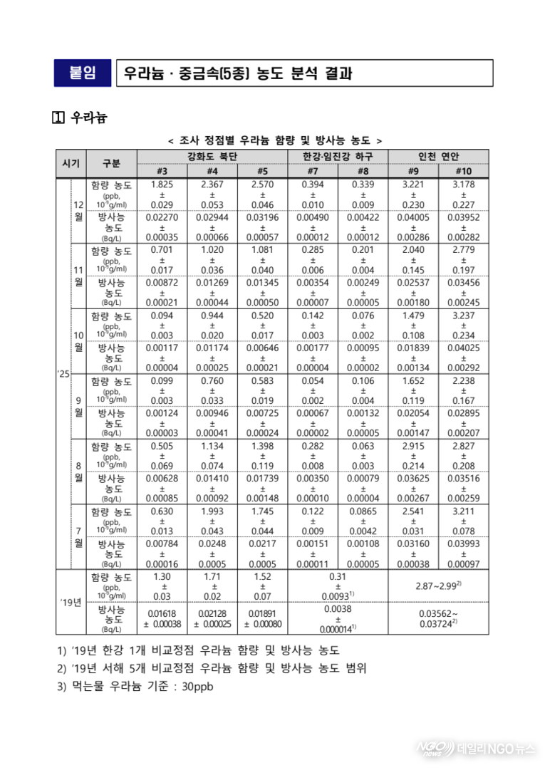 ◆ 12월 초 7개 주요정점서 시료를 채취 우라늄과 중금속(5종) 분석한 결과 ''이상 없음'' 확인