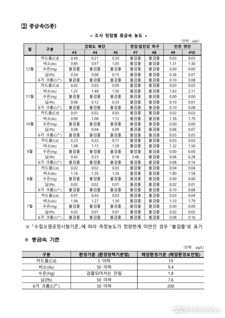 중금속(5종) 과 관련 해서도 '이상 없다'라며 '7개 정점에서 중금속 5종 농도는 환경기준 및 해양환경기준 미만이거나 불검출되었다'고 밝혔다.