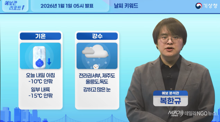 【 기상.날씨/ 눈.강추위 】 안녕하세요, 예보관리포트 기상청 예보분석관 복한규입니다. 오늘의 날씨 키워드는 기온과 강수입니다. 그럼 자세히 알아보겠습니다.