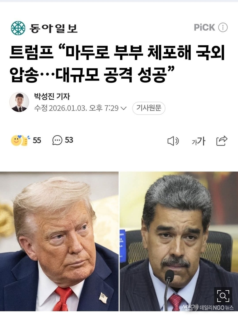 ◆ '마두로 부부 생포 베네수엘라 밖 옮겨진 것 ... 청와대는 저녁 외교부 긴급 대책회의 소식 전해'