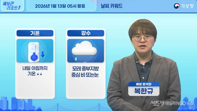【 동영상.기상=기온 강하 】안녕하세요 예보관리포트 기상청 예보분석관 복한규입니다 오늘의 날씨 키워드는 기온과 강수입니다 그럼 자세히 알아보겠습니다
