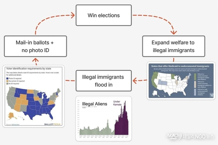 ◀ 복지 혜택을 대폭 확대하고 비시민권자에게까지 지급함으로써 불법 이민을 부추기는 행위 ◀ 국경을 개방하는 것 ◀ 망명 신청에서 시민권 취득으로 이어지는 신속 절차를 만들고, 우편 투표를 허용하며, 투표 시 사진이 부착된 신분증 제시를 폐지하는 것 ◀ 선거에서 승리하는 것 ◀ 일당 독재 체제가 될 때까지 이 과정을 반복하는 것.