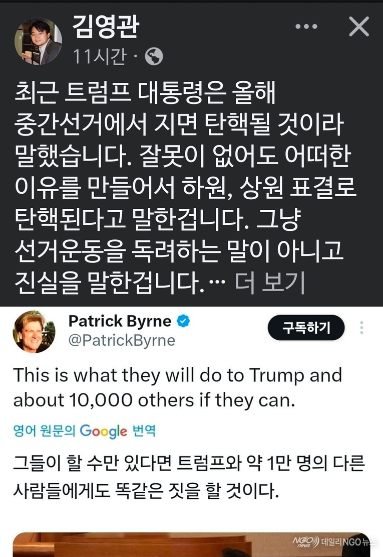 패트릭 번은 윤대통령 재판에 대한 제로헷지의 기사를 인용하며, “그들이 가능하다면 트럼프와 대략 1만 명 정도의 다른 사람들에게 저지르려는 짓이 바로 이것이다.”라고 말했습니다.