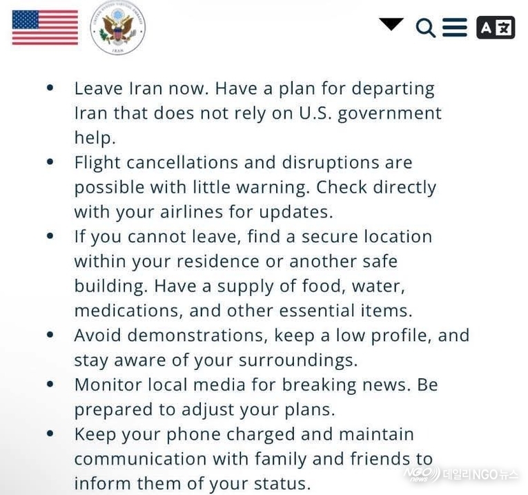 [데일리NGO뉴스 = 이란 .美시민 출국 권고]