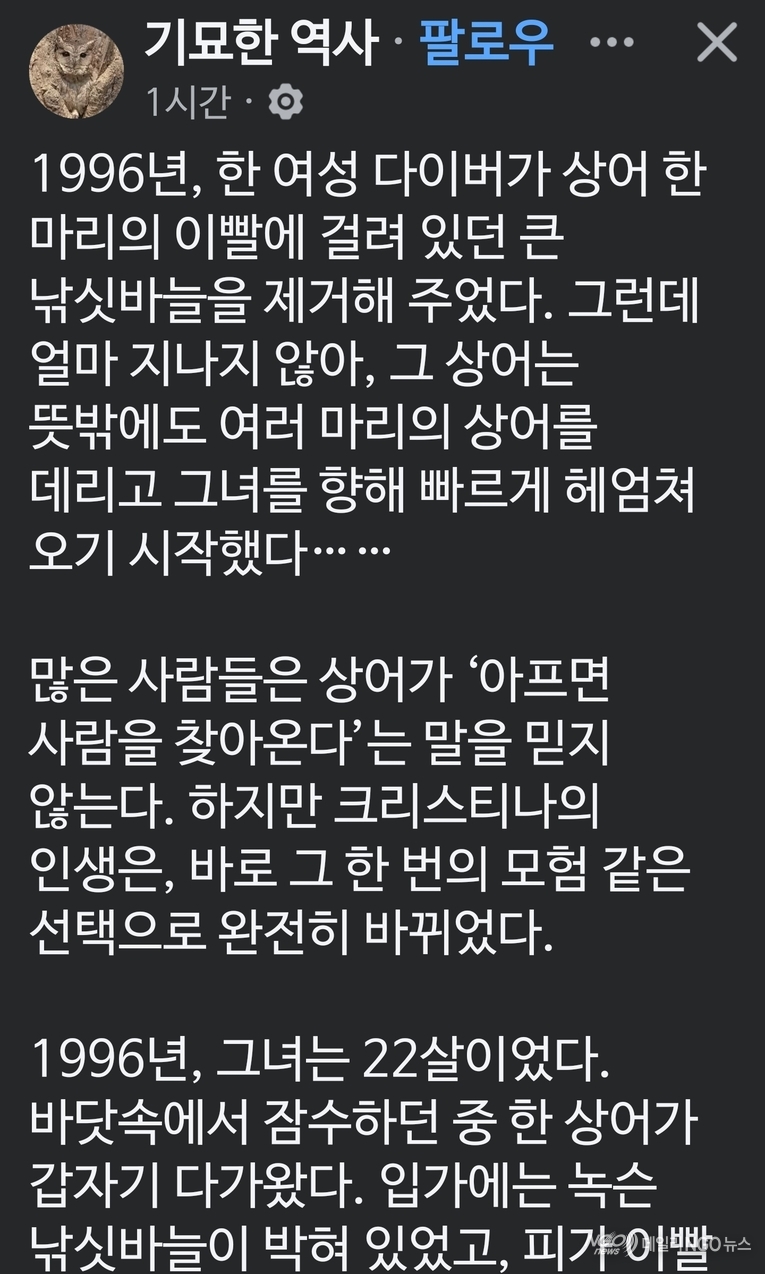 ◆ '기묘한역사' 커뮤니티, 한 여성 다이버 '상어 한 마리의 이빨에 걸려 있던 큰 낚싯바늘 제거해줘'