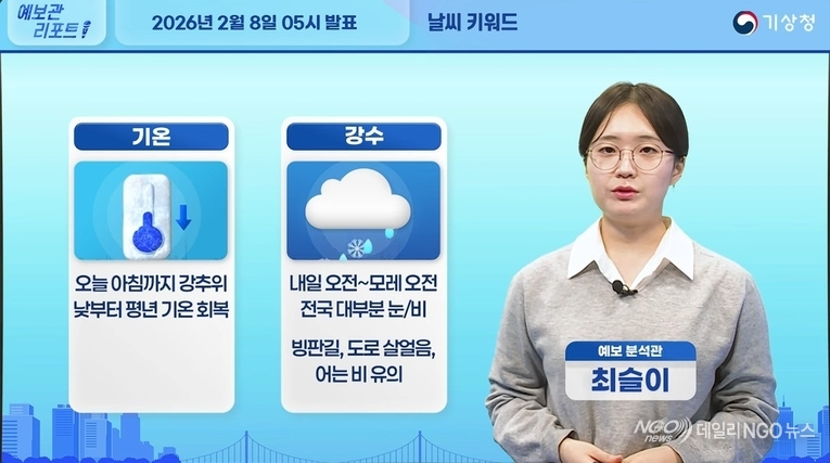 【 기상.날씨/ 건조. 비.눈 】 안녕하세요. 예보관 리포트 기상청 예보분석관 최슬이입니다. 오늘의 날씨 키워드는 기온과 강수입니다 그럼 자세히 살펴보겠습니다.