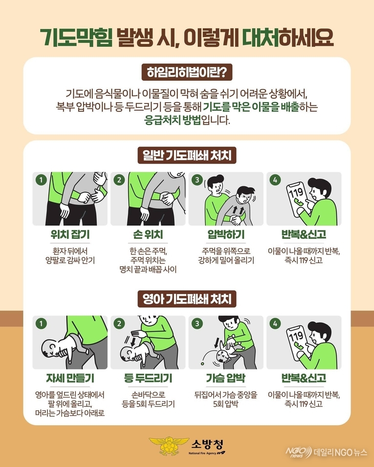 【 소방청= 기도막힘 대처 】소방청( 청장직무대행 김승룡)은 설 연휴를 맞아 식사나 음식을 섭취할때 자주 발생하는 '기도막힘'사고와 관련 응급 대처법인 '하임리히법'에 대한 대 국민 공지 홍보 카드를 내놓고 주의를 당부했다.