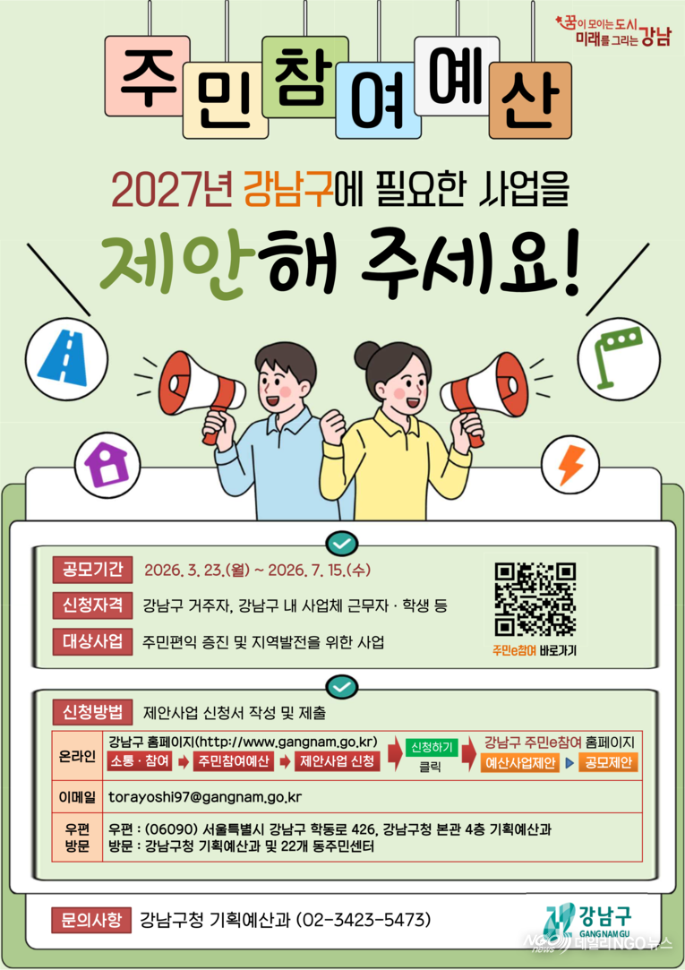【 지방자치=서울시 강남구 】 꿈이 모이는 도시, 미래를 그리는 강남구(구청장 조성명)가 2027년도 예산편성에 반영할 주민참여예산 제안사업 공모를 3월 23일부터 7월 15일까지 진행한다.