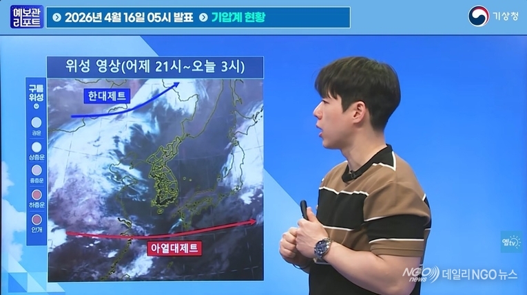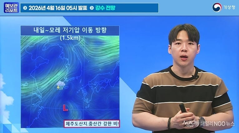 한편 내일과 모레 제주도남쪽해상에 위치한 저기압의 영향으로 제주도와 남부지방, 충청권을 중심으로 비가 내리겠고 특히 많은 수증기가 유입되고 지형 효과까지 더해지는 제주도산지·중산간에는 내일 오전부터 밤사이 시간당 10~20mm의 강한 비와 돌풍과 함께 천둥·번개가 치는 곳이 있겠으니 시설물 관리와 안전사고에 유의하시기 바랍니다. 지금까지 예보관 리포트였습니다. 【 기상청 예보분석관 김환빈 】