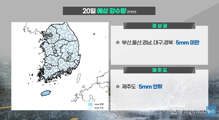 한편 제주도는 제주도남쪽해상에 위치한 저기압의 영향으로 대체로 흐리고 늦은 오후까지 5mm 안팎의 비가 내리겠습니다