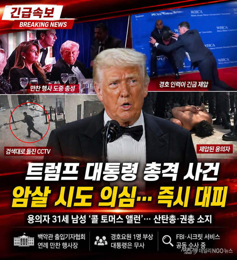 【시사토픽Q= 국제.워싱턴/ 백악관 만찬장 총격 사건 】 여러분 안녕 하십니까? 데일리NGO뉴스 시사방송 뉴스 채널 시사토픽Q '긴급 뉴스 특보'입니다.