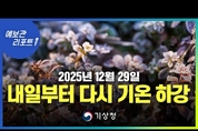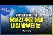 [데일리NGO뉴스 = 동영상.기상.날씨/ 추위. 해넘이돋이 가능] ◆ 경기내륙.강원내륙.산지, 경북북동내륙.산지 한파특보 발효 전국 대부분 아침 기온 –5℃ 이하 ◆ 경기내륙.강원내륙.산지 중심 –10℃ 이하로 떨어진 곳도... 내일 아침 전국 대부분 –10℃ 안팎 ◆ 경기내륙과 강원내륙.산지, 경북북동내륙.산지 중심 –15℃ 안팎떨어지며 한파 특보 확대.강화 ◆ 내일 밤부터 전라서해안.제주도 눈...모레 충남.전북 서해안,남부내륙, 전남권서부,제주도 비.눈 ◆ 대부분 해넘이와 해돋이 볼 수 있고, 전라서해안과 제주도는 어렵지만, 일부 구름 사이로 가능 【 동영상=기상.날씨/ 강추위 】 안녕하세요, 기상청 예보관리포트 예보분석관 구민철입니다. 2025년의 마지막 날인 오늘의 날씨 키워드는 기온과 강수입니다. 그럼 자세히 알아보겠습니다. 먼저, 기온입니다. 어제부터 우리나라는 중국 북부지방에서 남동쪽으로 이동하는 고기압의 영향을 받아, 북쪽에서 찬 공기가 유입되었는데요. 이로인해 경기내륙과 강원내륙.산지, 경북북동내륙.산지에는 한파특보가 발효된 가운데, 전국 대부분 지역에서 아침 기온이 –5℃ 이하로 떨어지고, 경기내륙과 강원내륙.산지를 중심으로 –10℃ 이하