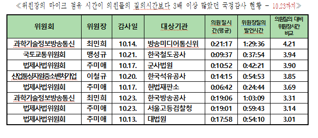 ▲ 헌정사상 처음으로 참고인 된 사법부수장인 대법원장 / 앉아서 질문 받으세요 ▲ 대법원장 이석 불허 90분 감금논란(10.13. 법사위-대법원) / 대법원장 이석 안시키고 질문 계속논란(10.15. 법사위-대법원) ▲ 헌정사상 처음으로 야당간사 없는 국정감사 / 간사는 필요적 법정기관(국회법 제50조① 위원회에 각 교섭단체별로 간사 1명을 둔다. 제49조②위원장은위원회의의사일정과개회일시를간사와 협의하여 정한다.) ▲ 고성 항의로 곽규택 의원 발언권 제한(10.16. 법사위-감사원) ▲ 발언권 제한 중 곽규택 의원의 발언순서를 변경(10.17. 법사위-군사법원) ▲ 질의방해 최혁진 의원과 질의 중 주진우 의원의 다툼으로 둘 다 퇴장명령(10.21. 법사위) ▲ 고성 항의로 신동욱 의원 퇴장명령(10.23. 법사위) ▲ 편파 진행 논란으로 연일 파행 - 고성ㆍ삿대질ㆍ서서항의 등 ▲ 감사위원보다 평균 2.81배 발언을 한 위원장 ▲ 위원장의 국정감사 중 질의 및 발언 시간에 대한 자세한 사항은 26~30쪽 참조