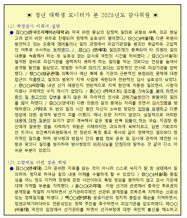 모니터단은 금번 2차년도 국정감사와 관련 '역대 최악의 권력분립 파괴 저질 국정감사'라고 밝혔으며 청년.대학생.시민단체로 구성된 모니터단의 세부 사안을 상세하게 분석해 조목조목 평가 결과를 발표했다.