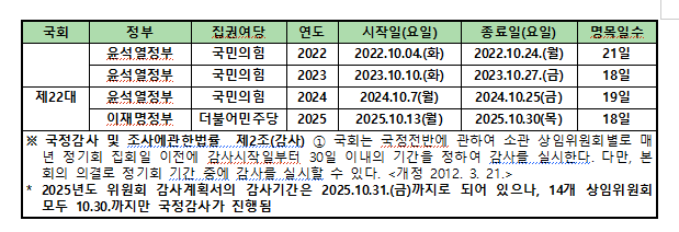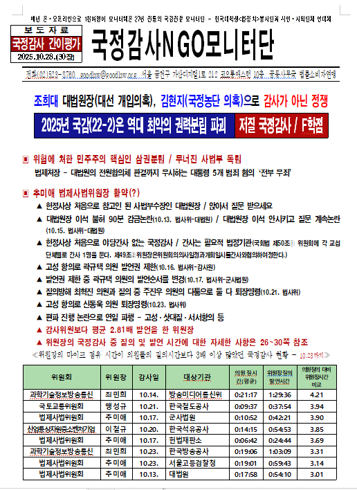지난 27년 동안 전국의 국감현장을 정밀모니터ㆍ평가해온 ‘국정감사NGO모니터단’(상임공동단장 김대인 외/ 집행위원장 홍금애/사무국장 윤소라)은 국회의 종합국정감사에 앞서 2025년 제22대 국회 2차년도(22-2) 국정감사를 모니터하여 국감을 간이평가하면서, 이재명 정부의 첫번째 국정감사, 1988년 부활된 지 38년째 국정감사, 여야 정권교체 후의 여대야소 국정감사인 금년도(22-2) 국정감사를 낙제점인 “F학점”<지난해 “D-학점” 2023년도 간이평가엔 C-학점>으로 평가했다.