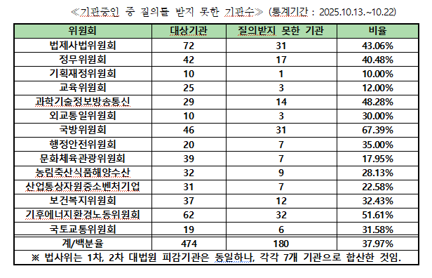 ▲ 정시에 감사개시된 국정감사는 단 3곳뿐 / 과방위(10.13.) 기재위ㆍ국방위(10.21.) ▲ 기후노동위(위원장 안호영)의 기상청 국감은 10월 17일 10시 4분에 감사개시해서 11시 51분에 감사종료하고 김포공항 등 현장시찰(당일 피감기관 17개 중 16곳은 질문을 받지 못함) ▲ 국회법 처리로 소관기관이 바뀜 -‘시험범위도 모르는 채 시험을 보는 격’(10.13. 기후노동위 파행)/ 산업위는 국감 중 국정감사계획서 변경(10.15. 감사기관 61개→40개로 변경) ▲ 작년 국정감사 결과보고서 채택 안 한 위원회도 3개 / 국회법에는 국감 후 90일 이내 결과보고서 제출 / 기재위(위원장 임이자), 운영위(위원장 김병기), 산자위(위원장 이철규) ≪10.24. 현재≫ ▲ 국회법상 30일 할 수 있는 국감을 18일만, 그것도 자료준비(위원회당 일주일에 2,3일)한다고 쉬고 시찰(총24회)간다고 쉬어서 실제 감사일자는 위원회당 7-8일에 불과 / 역대 최다의 감사대상기관(813개, 2024년 802개 보다도 11개 늘어)-- 질문 안 할 거면 왜 부르나? 10월 22일까지 474개 기관 중 180개 기관은 한 차례도 질문 못 받아(37.97%)