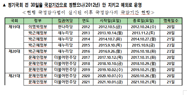 또한, “새 출발한 이재명 정부의 정책에 대한 미비점을 발견하고 예산낭비 사례나 부정부패 사례의 점검 없이 기업이나 민간인을 불러 민원성, 정쟁성 국정감사를 하는 것은 사라져야 한다”고 지적했다.