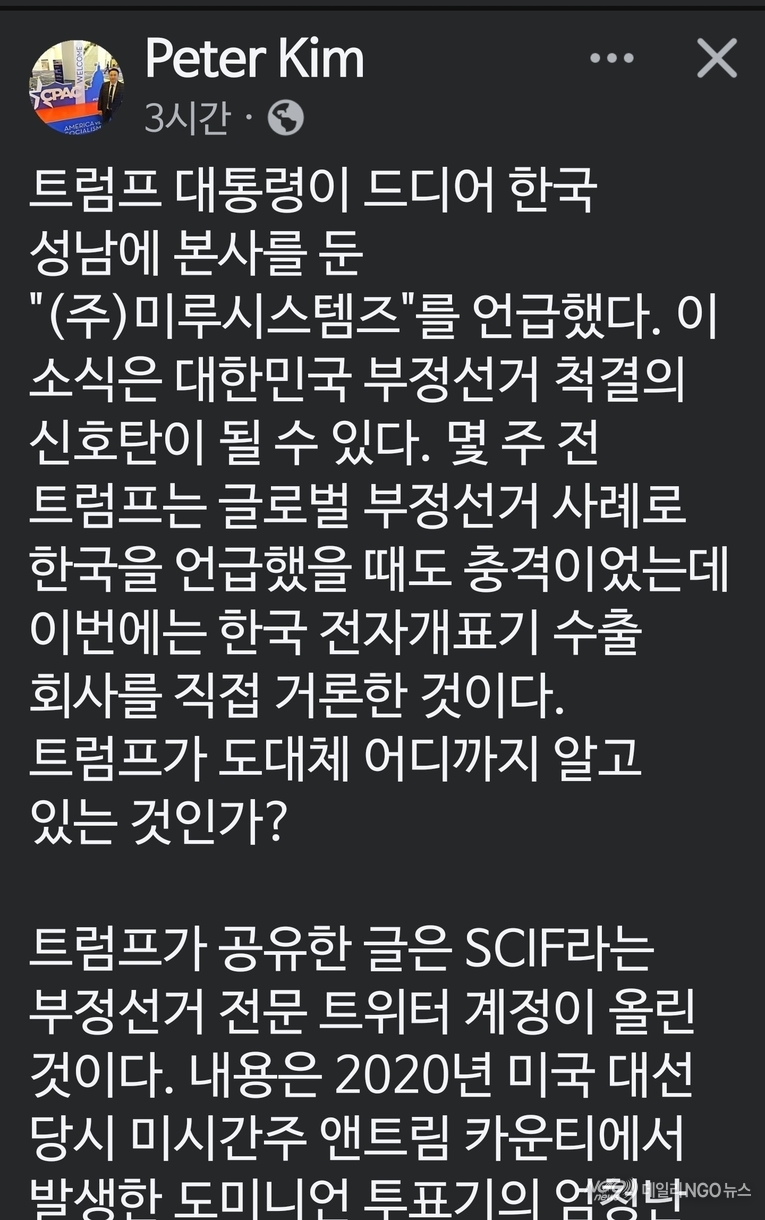 Peter Kim은 SNS 글에서 '트럼프 대통령이 드디어 한국 성남에 본사를 둔 "(주)미루시스템즈"를 언급했다. 이 소식은 대한민국 부정선거 척결의 신호탄이 될 수 있다'라면서 '몇 주 전 트럼프는 글로벌 부정선거 사례로 한국을 언급했을 때도 충격이었는데 이번에는 한국 전자개표기 수출 회사를 직접 거론한 것이다. 트럼프가 도대체 어디까지 알고 있는 것인가?'라고 그동안 제기되온 부정선거에 대한 국내 개입선의 발표에 드디어 포문을 열었음을 시사했다.